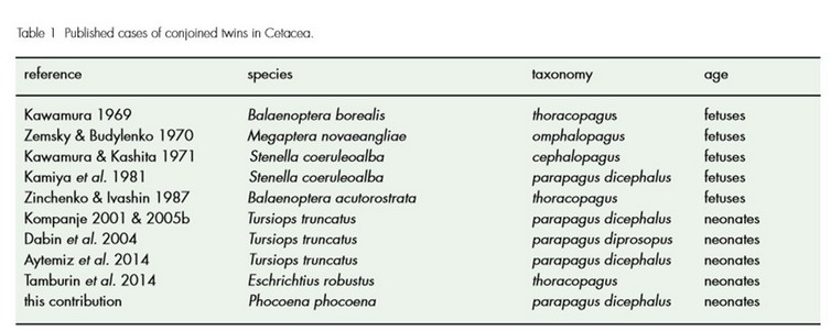 Die Veröffentlichung aus dem Naturhistorischen Museum Rotterdam, aus dem königlichen Institut für Meereswissenschaften auf Texel und dem Wageningen Institut für Meereswissenschaften in Den Helder betont, dass allein die Häufigkeit von Zwillingsgeburten bei Schweinswalen und Delphinen mit einem Anteil unter 0,5 % sehr selten ist. Darüber hinaus werden in der Literatur bis dato erst neun Fälle von „conjoined twins“ bei Walen und Delphinen dokumentiert. Die tabellarische Übersicht der Autoren verzeichnet am häufigsten Fehlbildungen mit zwei Köpfen und einem Rumpf (5), dreimal waren die Zwillinge am Brustkorb zusammengewachsen. Dreimal wurde die Anomalie bei Großen Tümmlern Tursiops truncatus Montagu, 1821 und zweimal bei Streifendelphinen Stenella coeruleeoalba Meyen, 1833 beobachtet; aber auch Bartenwale (Grau-, Sei-, Zwerg- und Buckelwal) sind in der Zusammenstellung vertreten. Der „siamesische Schweinswalzwilling“ ist der erste bisher in der Literatur beschriebene Fall.