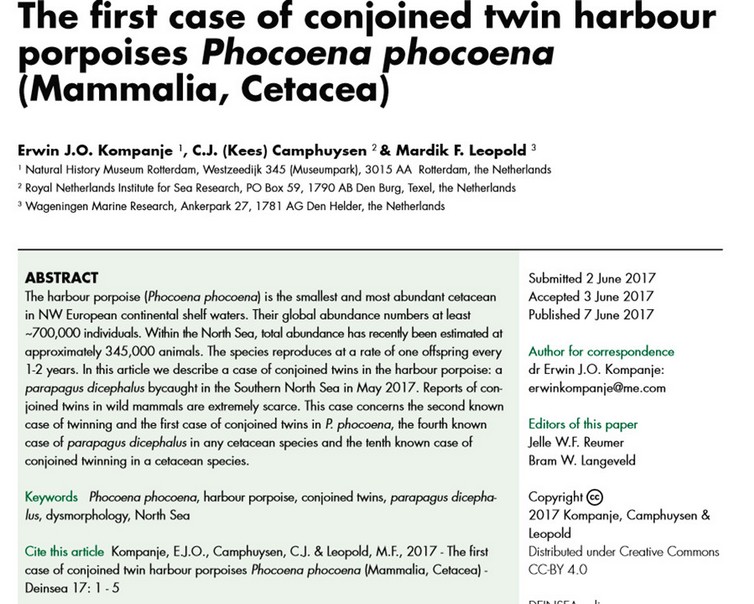 Am 30. Mai haben Schleppnetzfischer 15 Seemeilen westlich von Hoek von Holland einen Schweinswal mit zwei Köpfen beim Hol in ihrem Grundschleppnetz entdeckt und an Bord geholt. Sie machten Fotos, aber haben den geschätzt 70 cm langen und 6kg schweren Schweinswal aus Angst vor einer Strafe leider wieder auf See entsorgt, sodass das Exemplar nicht weiter wissenschaftlich untersucht werden konnte. Die Autoren Kompanje, Camphuysen und Leopold, die über den Fall am 7. Juni in der Fachzeitschrift DEINSEA berichten, bezeichnen den Schweinswalzwilling, der über zwei gleich entwickelte Köpfe, sowie zwei Flipper und über einen voll entwickelten Körper verfügt als „parapagus dicephalus“.