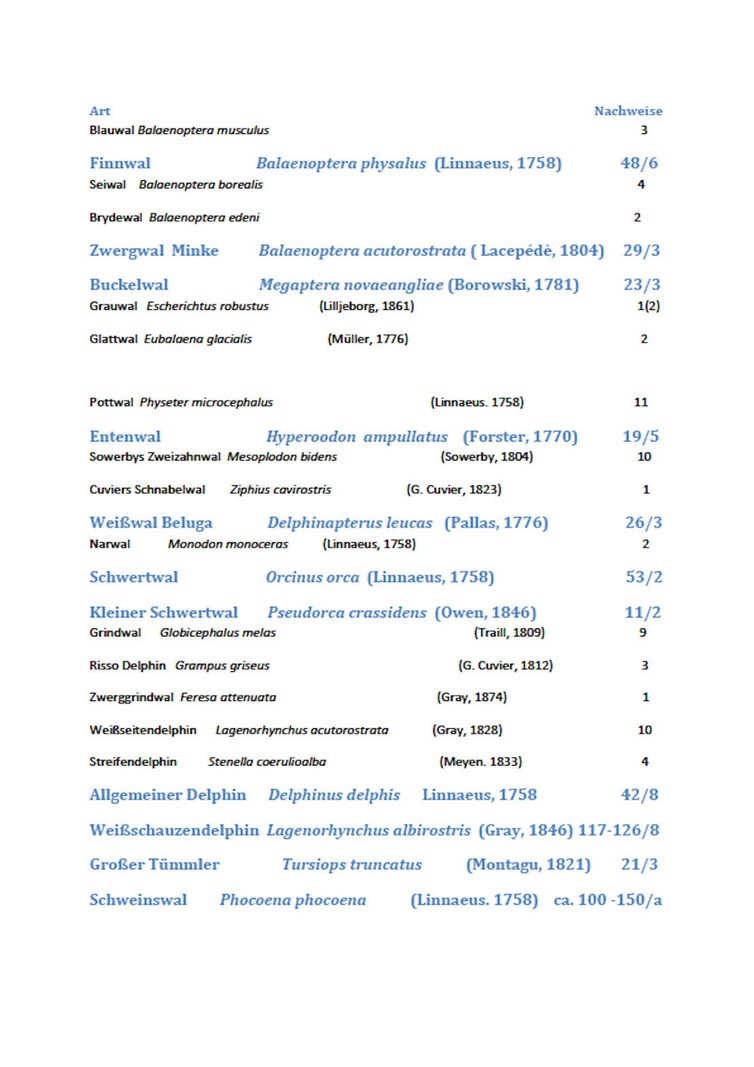 Bisher in der Ostsee beobachtete Barten- und Zahnwale: blau und hinter dem/ die für die Kieler Bucht relevanten Arten); bei den Schweinswalen wurde die durchschnittliche Anzahl von Totfunden zwischen Flensburg und Lübeck pro Jahr angegeben.