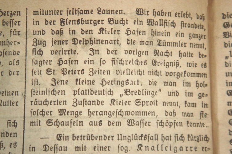 Eine bisher unbekannte Meldung über einen gestrandeten Wal in der Flensburger Bucht und Tümmler im Kieler Hafen. In den Flensburger Nachrichten vom 16. November 1869 nach Recherche von Carl Christian Kinze