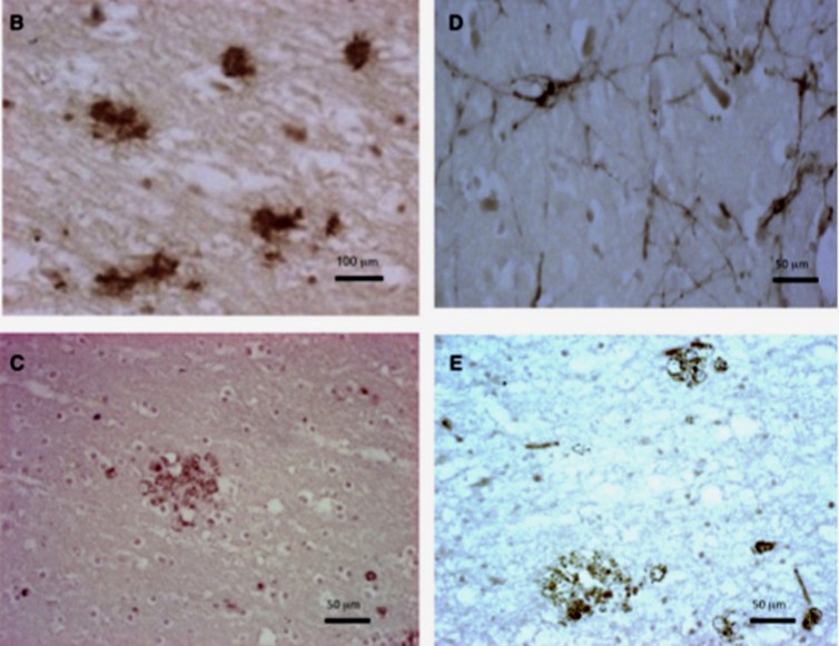 Histologische Schnitte aus verschiedenen Abschnitten der Hirnrinde eines gestrandeten Streifendelphins (Stenella coerulioalba Meyen, 1833) mit Amyloidablagerungen im Kleinhirn, Schläfenlappen und Frontalhirn.