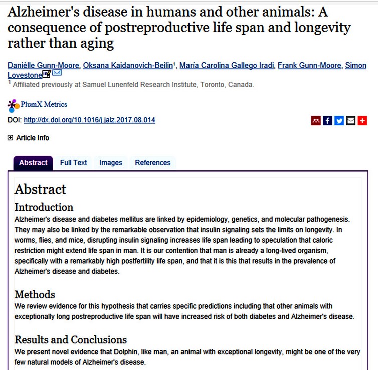 Amyloid ist eine extrazelluläre, fibröse Eiweißsubstanz, die sich in verschiedenen Geweben und Organen ablagert mit hoher Morbidität und Mortalität. Verschiedene Erkrankungen wie die Amyloidose z.B. der Leber oder Niere, Typ - 2- Diabetes mellitus, Alzheimer u. a. sind ursächlich darauf zurückzuführen. Im Nagetiermodell führt die Amyloid-Degeneration nicht unbedingt zum Verlust von Nervenzellen, aber Aspekte der Alzheimer Erkrankung finden sich auch bei einigen Arten in freier Wildbahn. Nach bisher vorliegenden Erkenntnissen tritt das Vollbild der Erkrankung nur beim Menschen auf. Die Arbeit zeigt, dass die Insulin Resistenz vom Typ - 2 – Diabetes mellitus sowohl das Lebensalter steigert als auch das Risiko, an einer Demenz vom Typ Alzheimer zu erkranken. Dies erlaubt die Vorhersage, dass andere Tiere mit einer ähnlich langen postreproduktiven Lebensphase ebenfalls daran erkranken können. Die Autoren untersuchen dies an einigen langlebende Cetacea und fanden Hinweise für Amyloid – Plaques sowie Verklebungen von Nervenfasern bei gestrandeten Delphinen. Dies ist der erste Nachweis einer derartigen Erkrankung bei Tieren in freier Wildbahn. An langlebenden domestizierten Tieren wie Katzen möchte man das Modell weiter untersuchen.