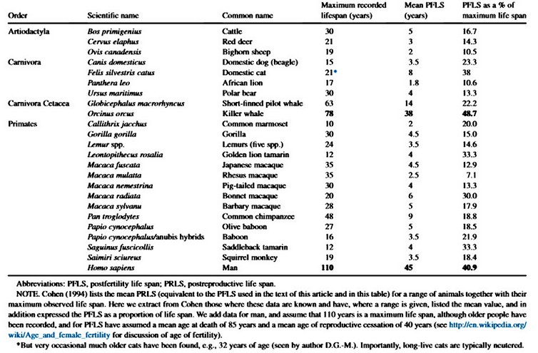 Die nachfolgende Tabelle aus der zitierten Arbeit auf Seite 4 zeigt wie ähnlich lang die postreproduktive Lebensphase von Schwertwal und Mensch ist.