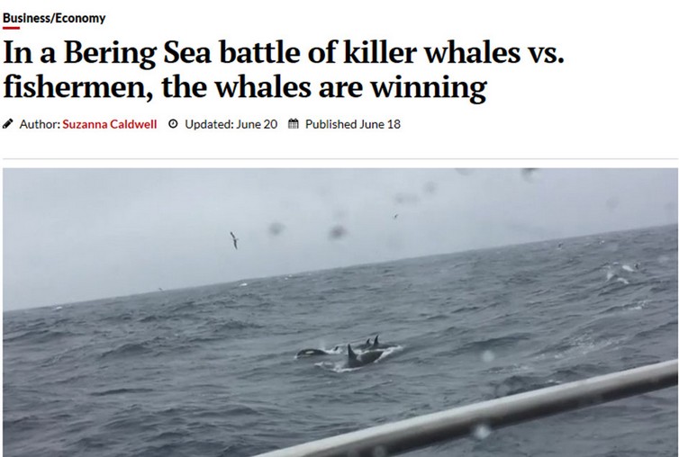 Die Reporterin Susanna Caldwell beschreibt darin, wie Fischer in der Bering See einen Teil ihres Fanges an Schwertwale (Orcinus orca Linnaeus, 1758) verlieren, die die Fische von den Haken der Langleinen plündern. Die Fischer könnten an einem Tag zwischen 10 und 15 Tonnen Heilbutt (Hippoglossus hippoglossus Linnaeus, 1758 ) fangen, am nächsten Tag aber, wenn die Schwertwale die Boote erst einmal entdeckt hätten, ginge der Ertrag gegen Null und bedeute einen realen Einkommensverlust. Manchmal fänden sich an den Haken dann nur noch die Lippen der Fische. Ein Fischer, der seit 1992 in der Region fischt, ist der Ansicht, dass die Anzahl der Schwertwalgruppen zugenommen hätte. Er berichtet folgendes: Im April des Jahres während einer Fangreise entlang des Kontinentalschelfs seien er und seine Crew ständig von Schwertwalen verfolgt und belästigt worden. Er habe einen Verlust von sechs Tonne Heilbutt gehabt, aber beim Versuch den Orcas zu entkommen 4000 Gallonen Sprit verbraucht. Ein anderes Mal hätte ihn in der Nähe der russischen Grenze eine Gruppe von Schwertwalen über 18 Stunden in einem Gebiet von 30 x 35 Seemeilen ständig verfolgt, obwohl die Maschine abgestellt war und das Schiff nur driftete. Nach zwei Tagen habe er aufgegeben. Ein andere Fischer, der seit 39 Jahren im Beringmeer fischt, gibt sofort auf, wenn Wale auftauchen: „It‘s gotten completely out of control!“