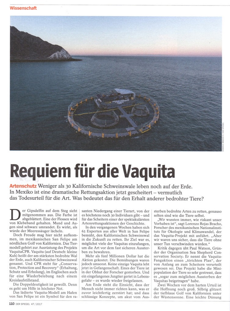 Bisher gibt es keine Erfahrungswerte, wie man die scheue, sicher auch stressanfällige Vaquita ohne psychische oder physische Verletzung fangen kann, und welche Voraussetzungen erfüllt sein müssen, um sie längere Zeit in Gefangenschaft zu halten, ganz abgesehen von der minimalen Erfolgswahrscheinlichkeit eines „ex situ“ Zuchtprogramms. Bis in die 90er Jahre des vergangenen Jahrhunderts hinein galt auch die Haltung von Schweinswalen (Phocoena phocoena Linnaeus, 1758) als problematisch. Die Maßnahmen sind jetzt im Golf von Californien angelaufen mit einem niederschmetternden Resultat: bei der Aktion kam eine adulte, weibliche Vaquita trotz eingeleiteter Reanimation ums Leben, und ein panisches Jungtier musste sofort nach der Fangaktion wieder freigelassen werden. So scheinen die geplanten Maßnahmen, sich in das Gegenteil zu verkehren, und den Restbestand der Vaquita zusätzlich zu gefährden. Auf den Einsatz von militärisch trainierten Großen Tümmlern (Tursiops truncatus Montagu, 1821) bei der Suche und beim Fang der Californischen Schweinswale hat man bisher verzichtet. Ein ausführlicher Bericht über die Vaquita ist in Vorbereitung.