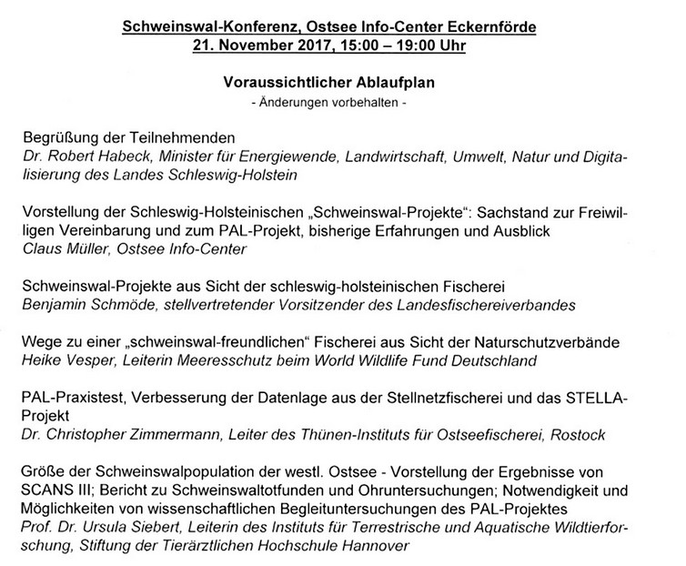 Moderiert wurde die gut besuchte Veranstaltung durch den Minister Herrn Dr. Robert Habeck. Neben den Ausführungen von Frau Prof. Siebert (ITAW TiHo Hannover) zur Gesundheit und den Todesursachen sowie dem Bestand der Schweinswale in der westlichen Ostsee stand die Wirksamkeit der freiwilligen Vereinbarung für den Schutz des Schweinswals im Focus der Diskussion , ebenso wie das neu eingeführte Schweinswalwarngerät PAL. Die Datenlage erlaubt bisher noch keine abschließende Bewertung, daher sind weitere wissenschaftliche Untersuchungen zur Klärung einiger noch offener Fragen erforderlich. Zusätzlich war mit Henning von Northeim ein Vertreter des Bundesamtes für Naturschutz (BfN) angereist, um über den Schweinswalschutz aus Sicht der Bundesbehörde zu referieren.