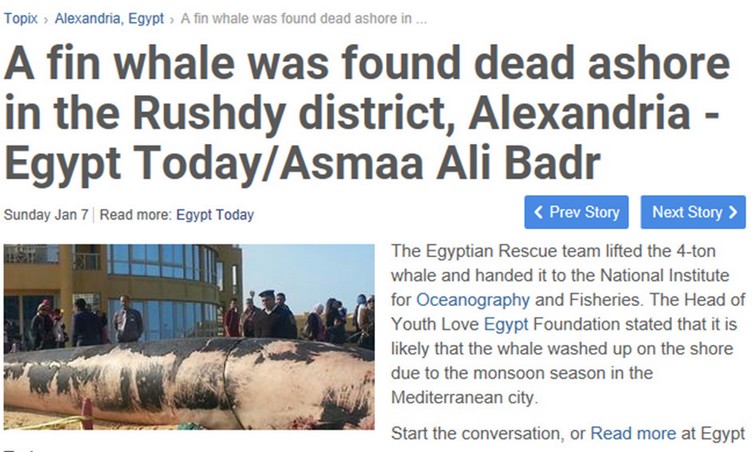 Wie aus Medienberichten der lokalen Medien in Alexandria/Ägypten Alexandria Egypt News hervor geht handelt es sich um einen Finnwal Balaenoptera physalus (Linnaeus, 1758). Allerdings ist die Mutmaßung, dass der Kadaver 4 Tonnen gewogen haben soll, ebenso aus der Luft gegriffen, wie die Ansicht des ägyptischen Umweltministers, der Wal habe Selbstmord begangen. Das Strandungsdatum ist Sonntag der 07. 01. 2018; leider wurde der Wal ohne weitergehende Untersuchung entsorgt.