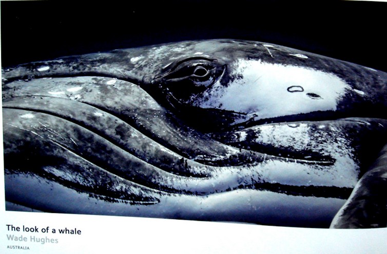 Im Gegensatz zu früheren Jahren findet man nur drei Fotos von Tieren der Ordnung Cetacea, darunter diese beeindruckende Aufnahme der linken Gesichtshälfte eines südlichen Buckelwals Megaptera novaeangliae (Borowski, 1781). Die Buckelwalmutter war vor den Tonga Inseln Vava‘u - einem vor Schwertwalattacken relativ sicheren Aufzuchtgebiet - mehrfach an dem Photographen Wade Hughes vorbeigeschwommen, um sicher zu sein, dass er keine Gefahr für ihr Junges bedeutet, daher der scharfe Blick auf den Photographen (Seite 26).
