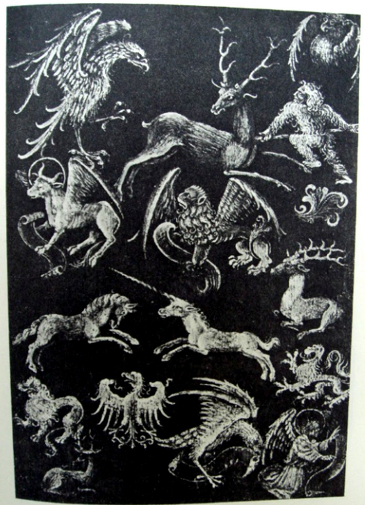 In dem Buch befindet sich keine Darstellung eines Meeressäugetieres, dagegen dieses Musterblatt aus der Umgebung des niederrheinischen Kupferstechers Meister E.S. (1420 – 1468). Es zeigt das sagenhafte Einhorn in Gesellschaft anderer Fabelwesen, bemerkenswert dabei die natürliche Form und Größe des Horns. Gerade im 15. Jahrhundert gibt es eine Reihe von religiös motivierten Darstellungen des Einhorns meist in Verbindung mit der Jungfrau Maria. In Nordeuropa sicher schon länger bekannt, hat es noch über Jahrhunderte gedauert, bis man in Mitteleuropa das „ Ainkhürn“ mit dem Narwal Monodon monoceras (Linnaeus, 1758) in Verbindung brachte.