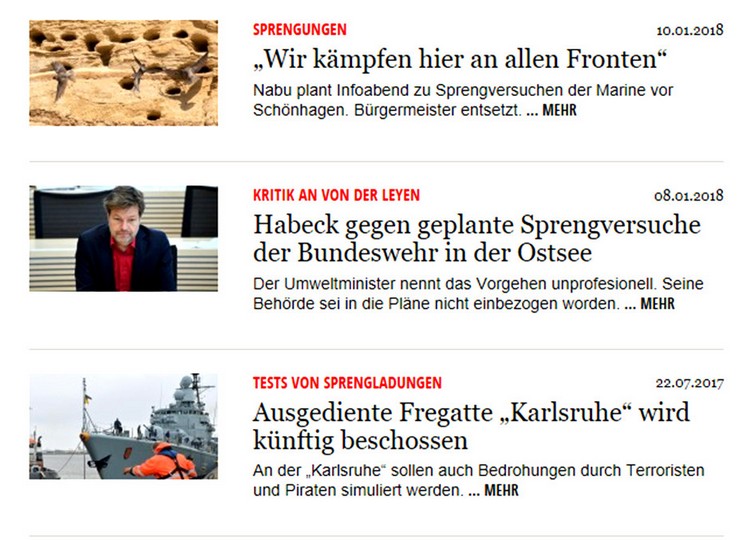 In der Zwischenzeit gibt es keinen vernünftigen Zweifel mehr an der Tatsache, dass Schweinswale regelmäßig vor den Küsten Schleswig Holsteins in den FFH Gebieten aber auch im benachbarten Sperrgebiet vorkommen. Obwohl während eines Workshop des OIC Eckernförde im Januar 2016 den Vertretern der Bundeswehr und der WTD 71 in mehreren wissenschaftlichen Vorträgen dargelegt wurde, wie häufig und wie schwer das Gehör der Schweinswale selbst bei kleineren Sprengungen geschädigt werden kann, setzen sich Bundeswehr und WTD 71 offensichtlich unbeeindruckt darüber hinweg und planen Sprengungen mit ungeeigneten Vergrämungsmaßnahmen.