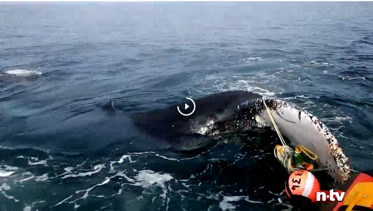 Ein Buckelwal wird vor Hawaii wird von Helfern von den 87m langen Leinen eines Fanggeschirrs befreit; anschließend soll er „vor Dankbarkeit“ mehrmals gesprungen sein.