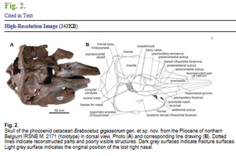 Schädelreste des Schweinswals Brabocetus gigaseorum aus dem Pliozän vor 5,3 und 3,6 Millionen Jahren wurde vor Belgien gefunden und ist neben Septemriocetus bosselaersi ein weiterer früher Schweinswal aus dem Nordatlantik Aus der Veröffentlichung: W. Colpaert, M. Bosselaers, and O. Lambert. 2015. Out of the Pacific: A second fossil porpoise from the Pliocene of the North Sea Basin. Acata Paleontologica Polonica 60(1):1-10