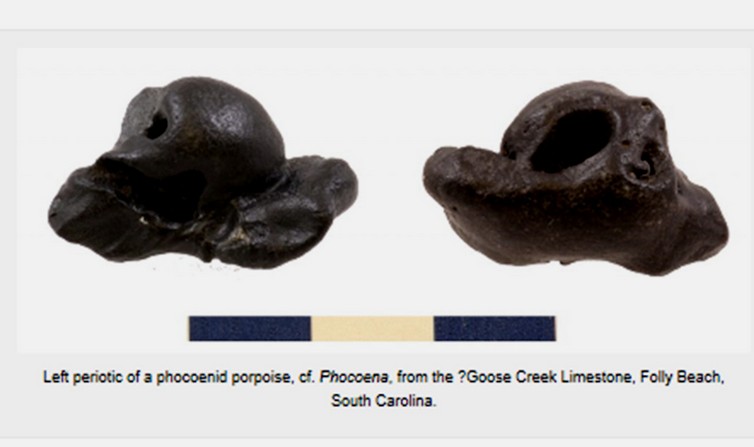 Unten die linke Bulla bzw. das Perioticum aus einer Sandvorspülung am Strand von South Carolina. Der Autor Robert Boessenecker ist sich nicht ganz sicher, ob sie zu einem Schweinswal oder vielleicht zu einem Delphin des Pliozäns gehört, er vergleicht die Unsicherheiten bei der Bestimmung mit „Black Magic“.