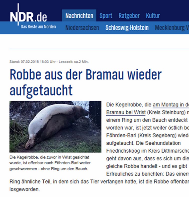 Eine Kegelrobbe wird mit einem weißen Reifen um den Thorax in der Bramau bei Wrist gesichtet. Die Seehundstation Freidrichskoog wurde informiert.