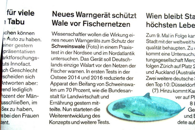 Mittwoch den 21. März 2018 shz: Neues Warngerät schützt Wale vor Fischernetzen