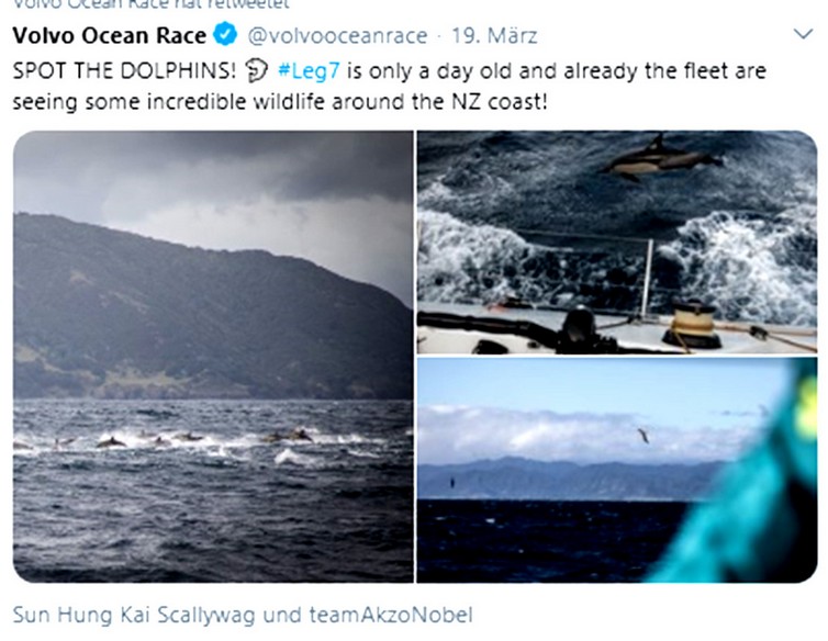 Einen Tag nach dem Start zur 7. Etappe des Volvo Ocean Race in Auckland NZL werden Delphine von Bord der AkzoNobel gesichtet und fotografiert. Es handelt sich soweit auf dem Foto erkennbar um Delphinus delphis Linnaeus, 1758;