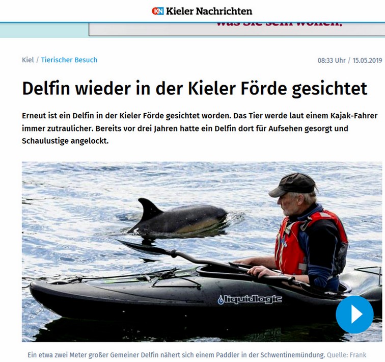 Vermutlich handelt es sich um das gleiche Individuum, das sich bereits am 9. April vor der Schwentine Mündung in die Kieler Förde aufgehalten hat, Art: Delphinus delphis Linnaeus, 1758