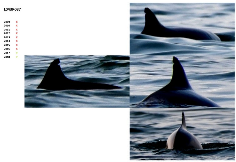 Dieser Schweinswal mit einer ungewöhnlich hohen Rückenfinne und der Kerbe wurde 2016 zuletzt fotografiert