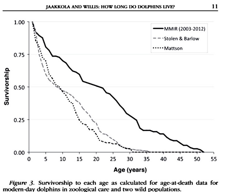In der Zusammenfassung kommen die Autoren Kelly Jaakola und Kevin Willis, die das Überleben von Gr. Tümmlern Tursiops truncatus (Montagu, 1821) in Delphinarien der USA untersucht haben, zu dem Schluß, dass die Lebenserwartung von Delphine in Delphinarien der wildlebender Tiere entspricht.