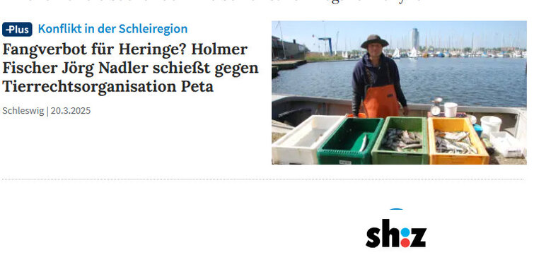 Der Holmer Fischer Jörg Nadler kritisiert die Organisation PETA, die die Jagd auf den Hering als „empathielos“ verbieten lassen möchte. Der Fischer, der einer auf dem Schleswiger Holm seit vielen Generationen ansässigen Fischerfamilien angehört, sieht die Hauptgefahr für den Hering in der Schlei in den „empathielosen“ Fressfeinden, die den Hering zwingen, ihren Laich unter Stress abzuwerfen.