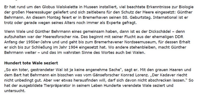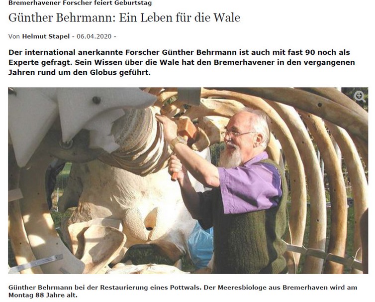 Dienstag den 7. April 2020: Weser-Kurier, Bremen: Walforscher Günther Behrmann wird 88 Jahre alt.