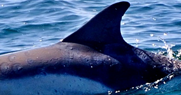 Das Foto des abtauchenden Delphins zeigt in der Vergrößerung eine alte in Abheilung begriffene Verletzung in Höhe der Schwanzwirbelsäule. Das scheint sie aber kaum zu behindern, schaut man sich die „Sprinteinlagen“ auf dem Video an.