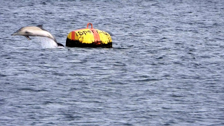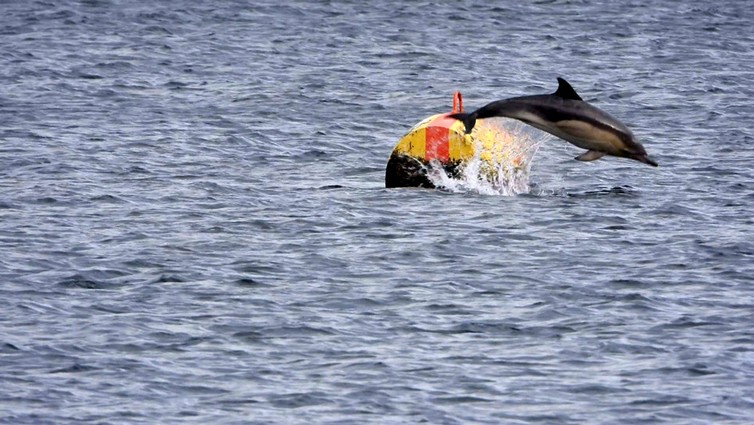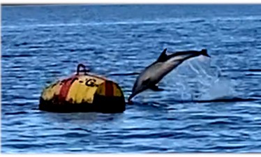 ECKERNFÖRDE | In der Eckernförder Bucht tummelt sich seit einigen Tagen wieder ein Delfin. Seit Ostern fällt er Spaziergängern immer wieder durch seine Sprünge auf. Gerade die Sperrgebietstonnen scheinen es ihm angetan zu haben. An ihnen springt er besonders oft aus dem Wasser, bevorzugt am Abend. Nach Auskunft des Walexperten Dr. Andreas Pfander aus Kappeln handelt es sich um einen „Gemeinen“ oder „Gewöhnlichen“ Delfin.