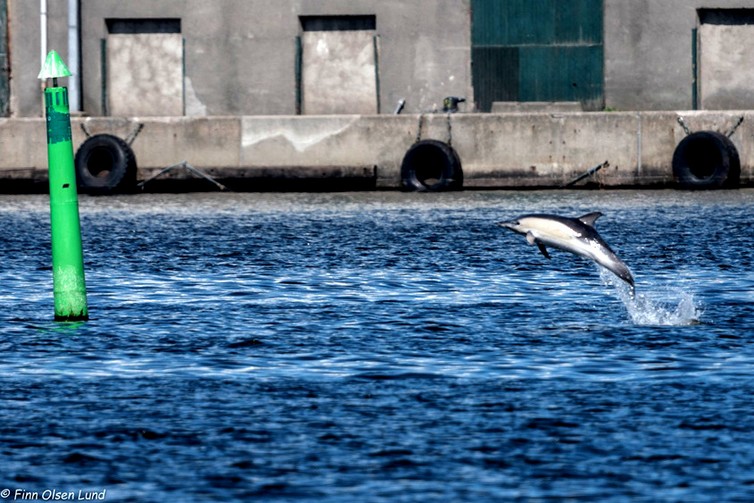 Am Samstag wird ein Allg. Delphin Delphinus delphis an der Steuerbordtonne im Limfjord NordJyske von Daniel Løth Nielsen fotografiert, der sein Foto auf der Facebookseite Hvaler.dk - Hval og sæl observationer i Danmark postet.