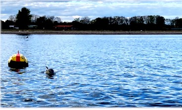 „…der Delphinus delphis scheint sich immer noch an der Sperrgebietstonne Nord aufzuhalten, vermutlich weil sich dort an einer Art Abhang sicher reichlich Fische u.a. Heringe aufhalten, denn dort steigt der Grund von 16 m auf 7,7 und 4 m an. Seine Länge dürfte knapp unter 200 cm liegen. Ob es sich tatsächlich um ein jugendliches Individuum handelt, ist möglich, aber schwer zu sagen. Um das Geschlecht zu bestimmen, brauche ich das Bild, auf dem mehr vom Bauch zu sehen ist.Wenn der Delphin schon über Ostern in der Eckernförder Bucht war, handelt es vermutlich um zwei Allgemeine Delphine (Aalborg und Eckernförde), sowie um einen Großen Tümmler im Svendborgsund.