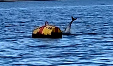 „Das hatte ich auch schon vermutet, hoffe aber auf Bilder mit mehr Bauch. Heute war die Delphinin zwischen 17h bis 17h30 wieder an der Tonne, aber ohne Sprung.“