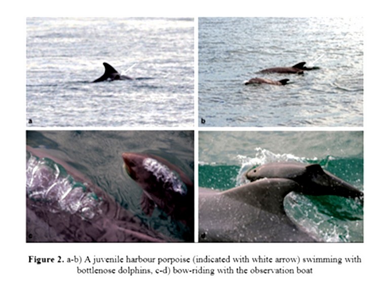 Die Autoren berichten über eine Ereignis am 25. April 2015 im Marmarameer, 0,7 NM vor der Küste auf einer Position 40° 60.000 N 28° 59.897 E. Während 113 Minuten wurde beobachtet, wie ein 90 bis 110 cm großer Schweinswal (Phocoena phocoena Linnaeus, 1758) neben einem Gr. Tümmler (Tursiops truncatus Montagu, 1821 ) schwimmt. Um Energie zu sparen, nutze er nach Einschätzung der Autoren wahrscheinlich die Strömung des neben ihm schwimmenden Gr. Tümmlers. Das Marmarameer ist mit jährlich 46000 Schiffsbewegungen eine sehr stark befahrene Wasserstraße ; daher liege die Vermutung nahe, dass die erfahrenen Gr. Tümmler den unerfahrenen, vermutlich noch nicht einjährigen Schweinswal begleiten, um ihn sicher durch den dichten Schiffsverkehr zu leiten. Dies Verhalten steht im Gegensatz zu einer Beobachtung aus der Kieler Bucht im Jahr 2016 und vor Sonderburg 2019. Auf das Konto des Freddy/Fiete genannten Gr. Tümmlers gehen vermutlich 8 tote Schweinswale, 2019 kam es lediglich zu einer aggressiven „Annäherung“.