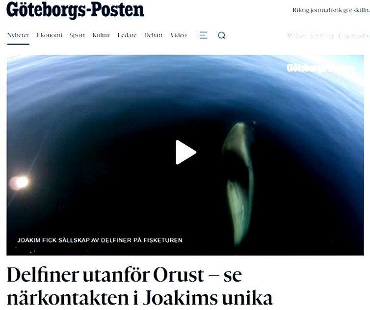 Den Fischer Joakim Larson begleiten im Skagerak vor Otust Västra Götalands län der Provinz Bohuslän mindestens 5 Weißschnauzen Delphine Lagenorhynchus albirostris , die er neben seinem Boot filmen kann. Das Video kann man bei Göteborgs-Posten und bei tv4 aufrufen.