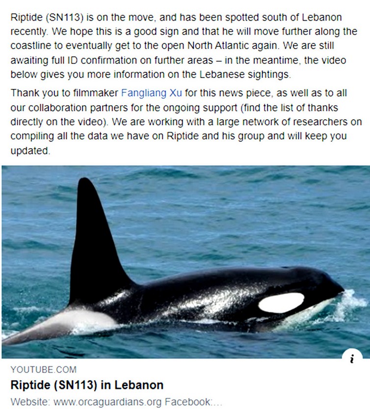 Ein männlicher Schwertwal ist im östlichen Mittelmeer an der Küste des Libanons aufgetaucht und gefilmt worden. Laut Auskunft der Leipzigerin Marie-Thérèse Mrusczok, die 2014 die isländischen Schwertwalschutzorganisation „Orca Guardians Iceland“ gegründet hat, stammt das Individuum aus isländischen Gewässern und wird von ihr als „Riptide SN 113“ identifiziert. Der Schwertwal hat danach eine Strecke mehr als 8 000 km in gerader Linie zurückgelegt.
