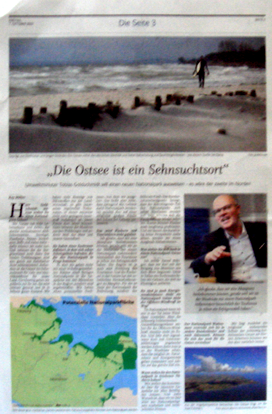 Wie der shz auf Seite 1 und 3 der Freitagsausgabe berichtet möchte der Umweltminister Tobias Goldschmidt im Frühjahr 2023 mit den Gesprächen zur Einrichtung eines Nationalparks Ostseemit „mit allen Beteiligten in der Region einsteigen“. Das Vorbild ist der Nationalpark Wattenmeer an der Westküste mit „Nullnutzungszonen“. Er glaubt, dass Tourismus und Fischerei davon profitieren würden. In einem ganzseitigen Interview erläutert der grüne Minister, welche Vorteile ein Nationalpark Ostsee auch für die Fischerei hätte, die in der Ostsee „mit erheblichen Herausforderungen zu kämpfen hat“, da sich die Fischbestände erholen könnten. Er drängt auf einen baldigen Beginn der Bergung von Munition aus dem Meer. Wichtig seien Gebiete, die sich als Pilotregionen anböten.