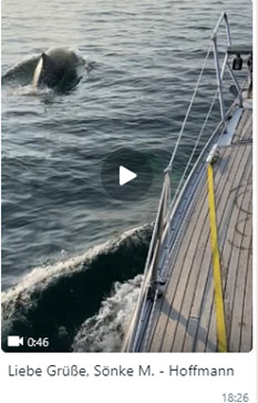 „Meine Kollegen haben am 24.04. einen Delfin zwischen Grömitz und Travemünde gefilmt. Das könnte mit der Sichtung der anderen Tiere stimmen. Allerdings war es nur ein Delfin…dass er sich mit Ihnen in Verbindung setzen wird.“