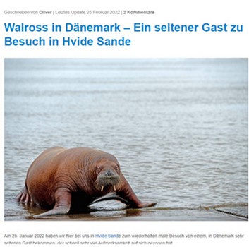 Ein Walross Odobenus rosmarus (Linnaeus, 1758) wird seit April 2021 an verschiedenen Küstenabschnitten Schottlands, Norwegens, Schwedens, von Dänemark, den Niederlanden und Deutschlands beobachtet. Die erste Beobachtung des sehr unternehmungslustigen weiblichen Individuums gab es am 27. Januar 2021 in Norre Vorupør, Thisted in Dänemark. Die letzte Meldung stammt aus Norwegen hier wurde „Freia“ zuletzt am 7. April Sørrollnes Norwegen/Finnmark auf einem Steg in der Nähe eines Lachskäfigs.