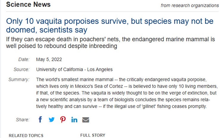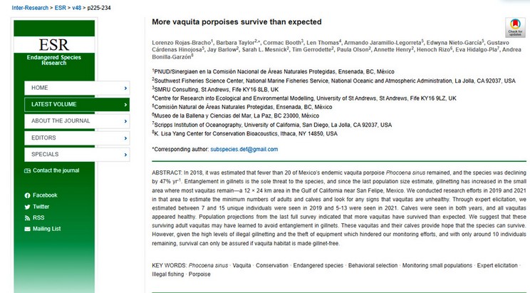 Die Veröffentlichung, an der 8 Institute aus den USA, Mexico und UK mit 15 Autoren beteiligt sind, berichtet über geschätzte(?) Sicht von 7 und 15 Vaquitas 2019 und 5 – 13 im Jahr 2021. Kälber wurden in beiden Jahren gesehen, alle Schweinswale erschienen gesund. Die Verfasser nehmen daher an, dass die erwachsenen Individuen gelernt haben, die Stellnetze zu vermeiden. Damit bestände Hoffnung, dass die Art so überleben könnte. Dennoch sei es wichtig, dass ihr Habitat frei von Stellnetzen ist.