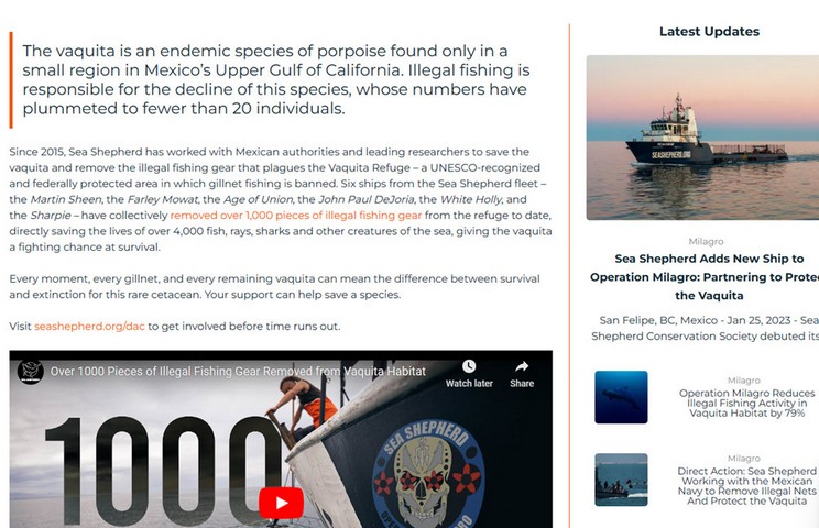 Der Seashepherd hat ein neues Schiff die Seahorse in den Dienst zur Rettung der verbliebenen Californischen Schweinswale gestellt. Die Organisation schätzt die Anzahl der noch lebenden Individuen auf weniger als 20. Dafür arbeitet man eng mit der mexikanischen Regierung und der Marine zusammen. Es geht darum die illegale Fischerei auf den Totoaba und Shrimps in der ZTA (Zero Toleranz Area des Vaquita Refuge) zu überwachen und zu verhindern. Vom 10. Oktober bis 5. Dezember 2022 gingen die illegalen Fischereiaktivitäten um 72% von täglich 745 auf 164 Stunden zurück. Auf der Seite sieht man wie illegale Netze, Treib-, Geister- und Stellnetze geborgen/geholt werden meist mit Beifang. Ein anderes Video zeigt die Zusammenarbeit im Rahmen der Operation MILAGRO mit der Küstenwache/Marine und die Bergung eines illegalen Stellnetzes.