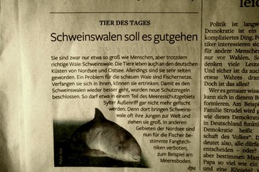 Das Sylter Außenriff und die Amrum Bank wurden auf Vorschlag der EU für die Fischerei gesperrt, wie der shz in seiner Ausgabe am Samstag (18. 02 2023) und in den Kindernachrichten am Montag berichtet. Zur Verbesserung der Situation der Schweinswale wurden neue Schutzregeln in einem wichtigen Aufzuchtgebiet beschlossen und Fangtechniken verboten, die dem Schweinswal und auch Seehunden gefährlich werden könnten. Dafür wirbt das Foto von Marco einem Schweinswal, der im Alter zwischen 14 Tagen und 4 Wochen am Strand von Sylt angespült und wider Erwarten erfolgreich rehabilitiert werden konnte. Ihm verdanken wir wesentliche Erkenntnisse darüber, wie Schweinswale in Stellnetze geraten und wie sie sich dann verhalten. Nun macht das 30 Jahre alte Foto von Florian Graner Werbung für Marcos Verwandtschaft in der Nordsee. Mehr dazu im Video „Kleiner Wal in großer Not“ auf www.gsm-ev.de