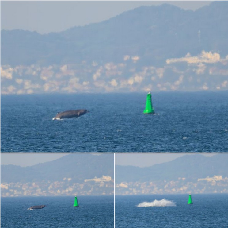 Kommentar: Die höhe des Blas, die Form der Finne und die Art wie der Wal wieder unter der Wasseroberfläche verschwindet sprechen für einen Finnwal Balaenoptera physalus (Linnaeus, 1758)