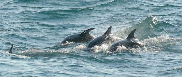 Kommentar: Aufgrund der großen, scharf pointierten Finnen könnten es vielleicht auch Weißschnauzen- Delphine Lagenorhynchus albirostris (Gray, 1846) gewesen sein.