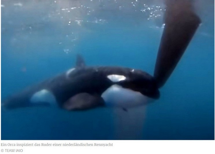 Kommentar: Ob die Schwertwale tatsächlich vorhatten die Yacht zu rammen, ist nicht ganz sicher, vielleicht waren sie nur neugierig. Auf jeden Fall entspricht das Auf-stoppen des Bootes guter Seemannschaft - zum Schutz der Besatzung und des Bootes.