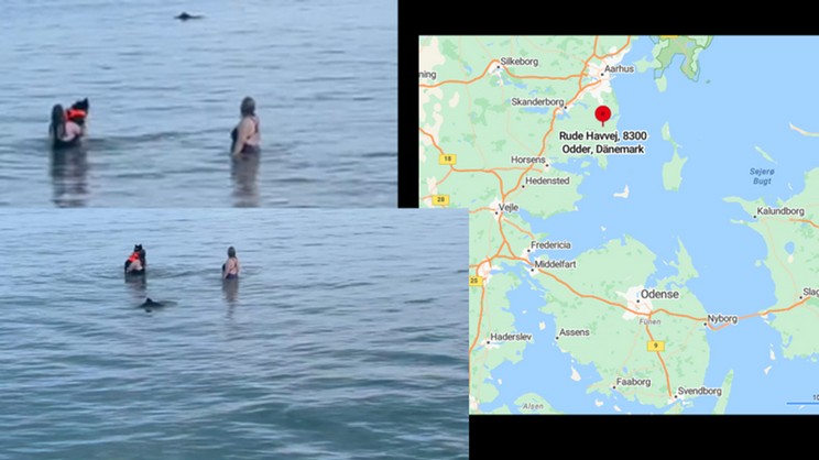 An Rude Strand von Odder sehen zwei Badende einen Schweinswal und eine hebt ihren Hund aus dem Wasser. So bemerken weder die Badenden noch der Hund, dass hinter ihnen ein weiterer Schweinswal auftaucht.