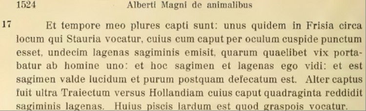 Kommentar: Mit 30 Tonnen bei 18m Länge ist der Pottwal deutlich untergewichtig, er sollte mindestens 40 bis 45 Tonnen wiegen. Es ist ein erwachsenes, geschlechtsreifes Individuum mit einem Alter über 20 und mehr Jahren, sicher kein sog „Bachelor“. Sowohl an der australischen Küste und in der Nordsee sind viele Pottwale gestrandet. Über den ersten Nachweis eines Pottwals bei Stavoren/Stauria in Friesland um 1254 oder 1257 berichtet Albertus magnus (Albert von Lauingen), der den durch Punktion gewonnenen klaren und reinen „Walrat“ abgefüllt in 11 Krügen selbst gesehen haben will, wie folgt: