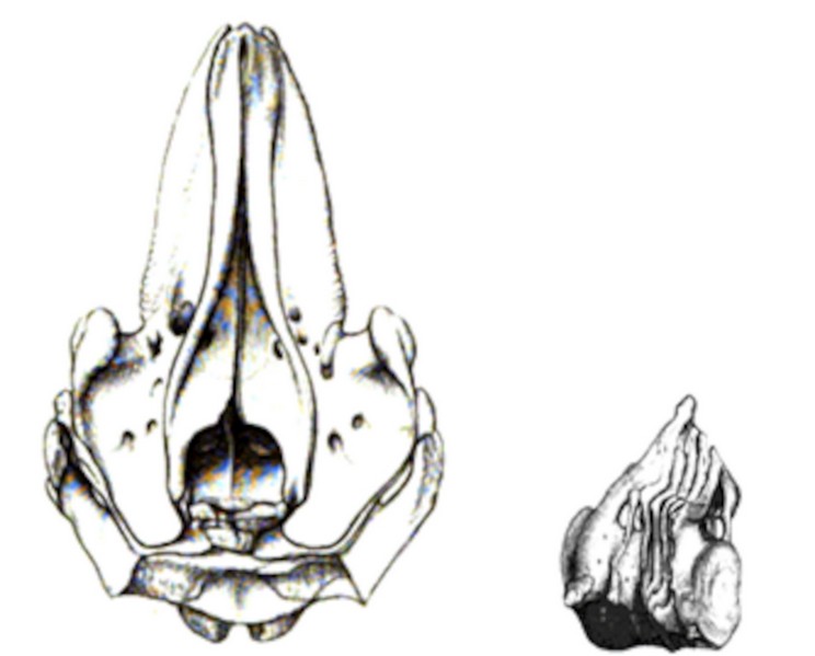Schädel und HWS des Schwertwals 1861 – Holzschnitt aus der Veröffentlichung von Lütken 1887
